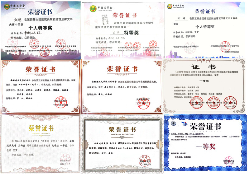学科竞赛不仅是大学生个人能力提升和展示的平台,也是学生实践创新能力提升的重要途径,更是促进学校教学改革和提高教学质量的有效抓手。近年来,法学专业聚焦立德树人根本任务,配置各类优质资源,推动和开展各项学科竞赛。经过院系两级的精心指导和悉心培育,法学同学近年获得二十多项国家级和省级大学生创新创业项目立项。更是在一系列高等级学科竞赛中屡获殊荣,连续6年指导学生蝉联全国建筑法律文书比赛特等奖,连续4年蝉联安徽省“学宪法、讲宪法”大学生法治素养竞赛一等奖及国家三等奖,获得安徽省模拟法庭比赛冠军、最佳辩手,全国商业精英挑战赛一等奖,安徽省大学生未来辩论赛中获二等奖,安徽省“学宪法、讲宪法”演讲比赛二等奖1项、三等奖3项,安徽省模拟政府比赛二等奖等多类国家级、省级赛事奖励,通过“以赛促教、以赛促学、以赛促创”,推动法学专业人才培养质量持续拔高。