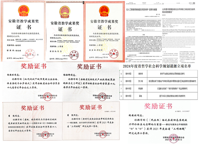 法学专业师资团队年龄结构、学历结构、学缘结构合理,“双师型”教师占比80%。拥有教育部、司法部“双千人才”2人,安徽省教学名师1人、教坛新秀3人,安徽省法学法律专家库成员2人、安徽省重大决策社会稳定风险评估专家库成员1人、安徽省网络法治专家库成员1人、安徽省土地法治专家库成员1人,1人入选安徽省优秀青年教师培育项目,3人入选省校级各类优秀人才培养项目。教师教学能力突出,获全国高校教师教学创新大赛安徽赛区一等奖4项、二等奖2项,安徽省青年教师教学竞赛一等奖1项,学校教学竞赛奖项10余项。